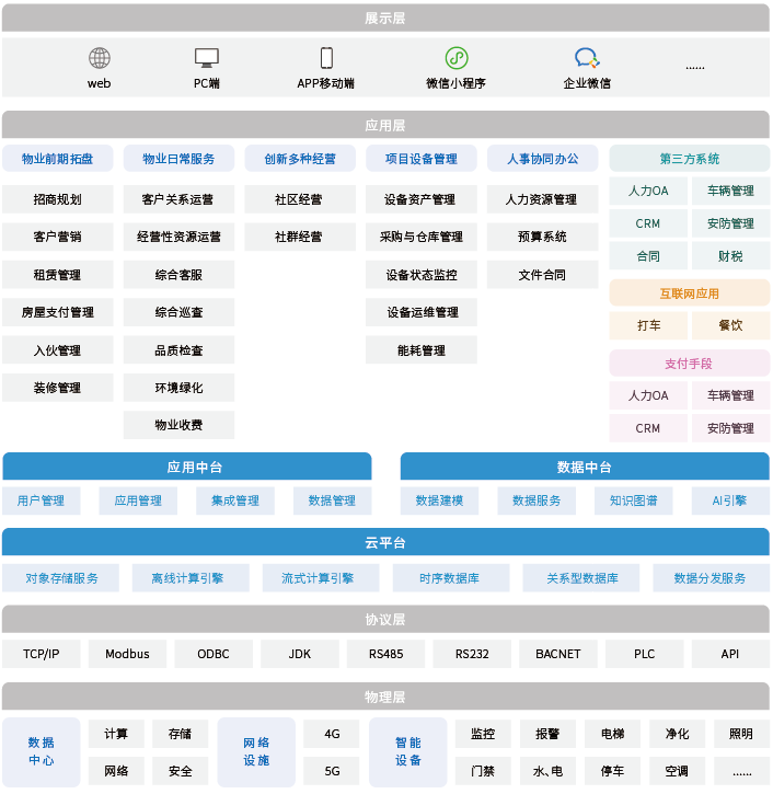 博尔利智慧物业管理平台,将物业企业日常管理过程中所涉及的项目设备管理、物业前期拓盘、物业日常服务、物业多种经营、人事协同办公等工作统一到一个平台上管理,同时可接入第三方OA、CRM、财税系统,以及互联网打车、餐饮等应用,帮助物业企业打造面向业主的一站式服务平台,提高业主的满意度,帮助物业企业获得服务差别优势。博尔利智慧物业管理平台可运用于商写公建、产业园区、住宅机构等不同业态。